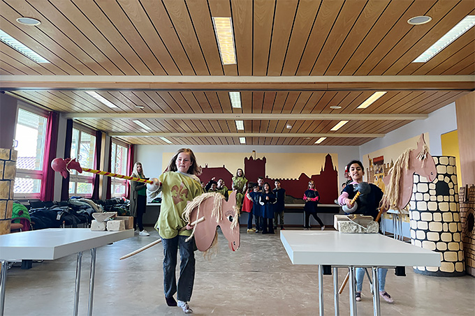 Es gab aber natürlich auch ordentlich viel Programm: Bei Ritterspielen konnten die Kinder unter anderem zeigen, wie gut sie einen Wildschweinbraten drehen oder mit der Lanze reiten konnten. Für die große Burgführung bastelten sich die Schülerinnen und Schüler Ritter- und Burgfräuleinskostüme. Zeitgemäß verkleidet erkundeten sie dann die mittelalterliche Festung samt Kerker und Schlossgespenst. Wer sich traute, durfte sogar auf den 30 m hohen Bergfried steigen und von dort die Sicht auf Bad Bentheim genießen.