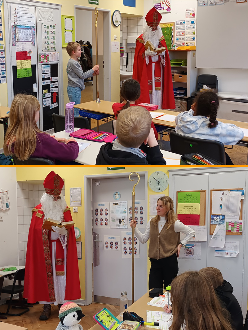 Immer wieder huschten neugierige Gesichter zu den Fenstern, denn alle warteten darauf, ob sich irgendwo ein Hinweis auf den erwarteten Besuch des Nikolaus finden würde. Dann war es endlich soweit: Eine Schelle, ein Klopfen an der Klassentür. Für einen Moment herrschte absolute Stille, bevor sich die Tür öffnete und der Nikolaus in seinem traditionellen roten Mantel eintrat. Die gespannte Ruhe verwandelte sich schnell in strahlende Begeisterung. Manche Kinder schmunzelten, andere rutschten ein Stück näher an ihre Tischnachbarn – und lauschten mit großer Aufmerksamkeit, als der Nikolaus zu sprechen begann. Die Schülerinnen und Schüler begrüßten ihn mit Gedichten und Liedern.