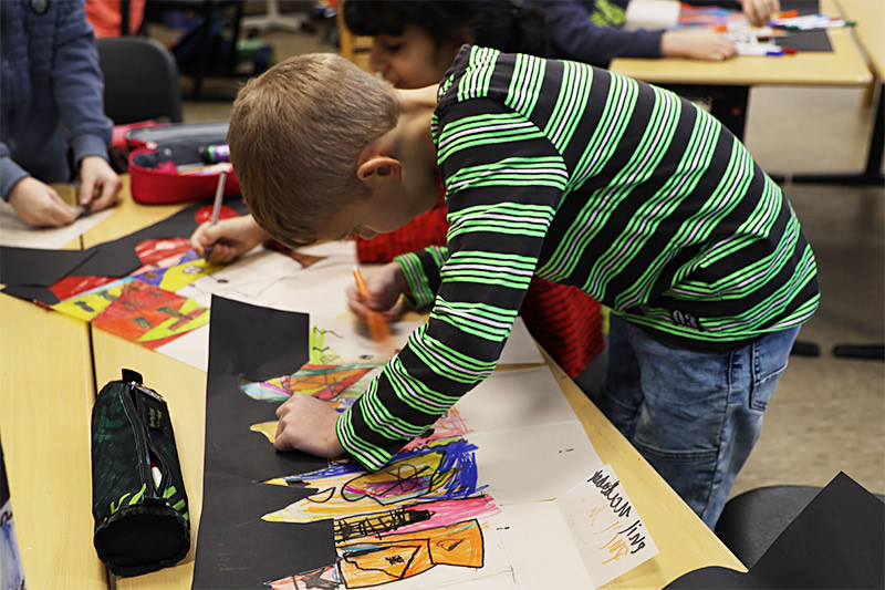 Drei Tage lang arbeiteten die Schüler und Schülerinnen klassen- und jahrgangsübergreifend in einem Kunstprojekt. Ganz im Sinne der Fridays-for-Future- Bewegung wurde zum Beispiel Müll in phantasievolle Figuren verwandelt. Außerdem wurden in Anlehnung an verschiedene Künstler Bilder und Skulpturen erstellt. Selbstverständlich wurde vorher darüber gesprochen, was für ein Mensch der entsprechende Künstler eigentlich war und welche Werke er oder sie veröffentlicht hat. Über die Künstler Otmar Alt, Friedensreich Hundertwasser, James Rizzi, Joan Miró und Jackson Pollock, sowie die Künstlerin Niki de Saint Phalle gab es einige spannende Informationen. Neben einzelnen Kunstwerken für die Kinder entstanden auch großformatige Gruppenergebnisse. Zum Beispiel eine Skyline nach Vorbildern von James Rizzi oder einige Farbexplosionen in der Projektgruppe, die sich dem Action Painting nach Jackson Pollock verschrieben hatte. Diese Werke werden in Zukunft die Franziskusschule schmücken. Zum Abschluss gab es für alle Gruppen einen Museumsrundgang durch die Schule, sodass jedes Kind alle Künstler kennenlernen und die intensive Arbeit gewürdigt werden konnte.